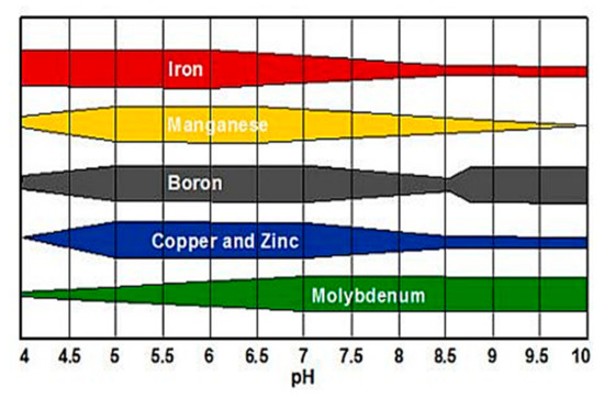 Micronutrients are generally available in acidic soils and are often unavailable at high pH. Soil pH is a key characteristic that affects the solubility and availability of plant nutrients. As shown in Figure 2, Fe, Mn, B, Cu, and Zn are mostly available between pH 5 and 7, and Mo is mostly available at pH higher than 7. At a low pH (<5), the solubility of Al, and Fe is high but low for molybdenum. Soil pH also affects the microbial community size and activity in the soil, which are responsible for breaking down organic matter and ensuring most chemical transformations in the soil to make nutrients available for plants [27].