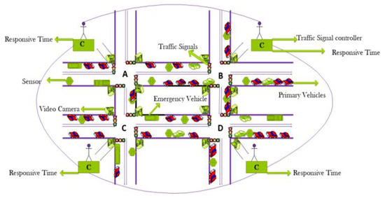 - The wireless sensors, cameras, primary vehicles, emergency vehicles, pedestrians, traffic, emergency, and pedestrians’ signals are added to keep the updates in the real-time traffic situation and to provide responsive time to control the traffic environment in efficient manners.
