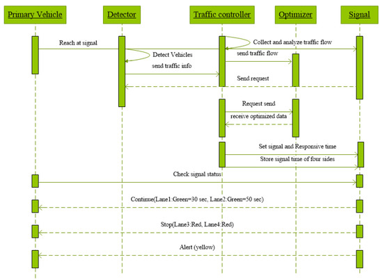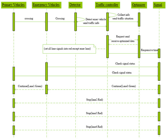 Figure 5 shows when objects of primary and emergency vehicles cross the detector. The detector detects the emergency vehicle lane at this time and will send data to the controller for further actions. The controller collects all information from detectors and passes current traffic information to the optimizer, which optimizes and sends the received data back to the controller. The traffic controller sets the responsive time on the signalized intersection at a specific lane. Priority is awarded to emergency vehicles, such as fire brigades, police, and ambulance, by turning signals in nearly all vehicle lanes, except lanes where emergency vehicles are crossing, into red. Other primary vehicles must stop because the emergency vehicle may pass in any lanes.