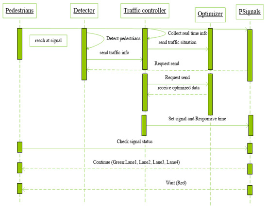 Figure 6 shows when the pedestrians will reach the footpath; detectors will act as cameras and sensors that detect the pedestrians, send information to the traffic controller, detect all pedestrians, and count the pedestrians at every lane. Next, the detectors send the current traffic situation to the traffic optimizer for future actions.