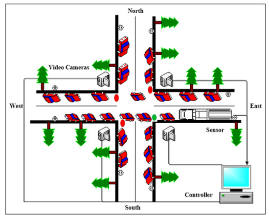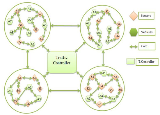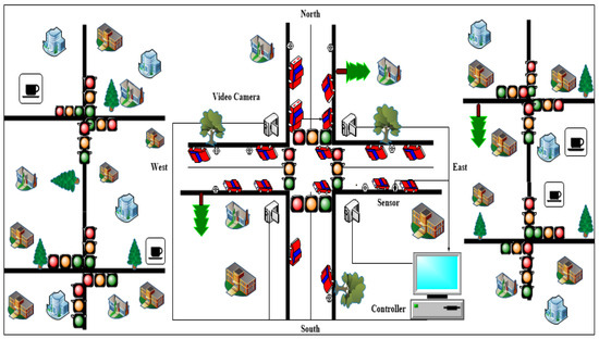 Information collection and vehicle detection can be easily performed using WSANs because of its advantages in wireless distribution, flexibility without cables, and low energy consumption. The use of wireless sensor networks can solve many difficulties in traffic information collection systems [10]. Using WSANs, the communication of one intersection to another intersection about road information will be provided with a group of sensors, cameras, and devices. WSANs work along with different nodes to perform multiple tasks for collecting information, monitoring traffic, and analyzing collected data at specific regions.