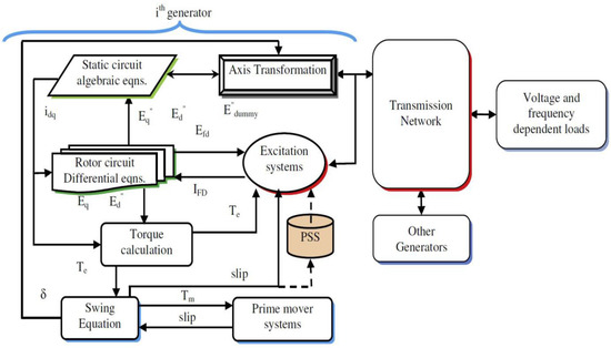 Due to the fast growth of power demand in recent years, the inadequacy of resources increases the complexity and remoteness of power systems. Accordingly, heavy loads are being imposed on the existing power system [1]. The stability of power systems defines the tendency and capacity of the power system to expand its restoration by keeping its equilibrium state after disturbances without extended loss of synchronism [2]. Damping of power system oscillations in a multimachine power system is extremely essential for the system operation security. As a result, a power system stabilizer (PSS) has been typically used to damp out the generator’s electromechanical oscillations modes in electric power systems [1,2,3].