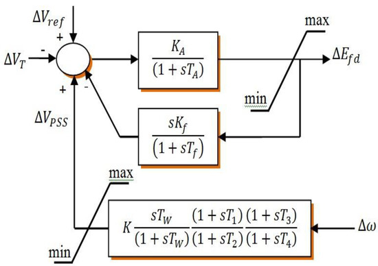 The conventional structure of the PSS is used in this study as shown in Figure 3, and its transfer function is given by Equation (4) [31,32]. PSS comprises a block of gain followed by a high-pass filter of time constant and a lead-lag structured phase compensation blocks with time constants: and . It is important to remind that the suggested stabilizers are designed to reduce the system oscillations under severe perturbations with a view to enhance the dynamic stability. The output stabilizer is a voltage signal that is added to the input voltage signal of the exciter system. The input signal of such a structure is usually the deviation of the synchronous speed . It can be displayed the transfer function as hereunder: