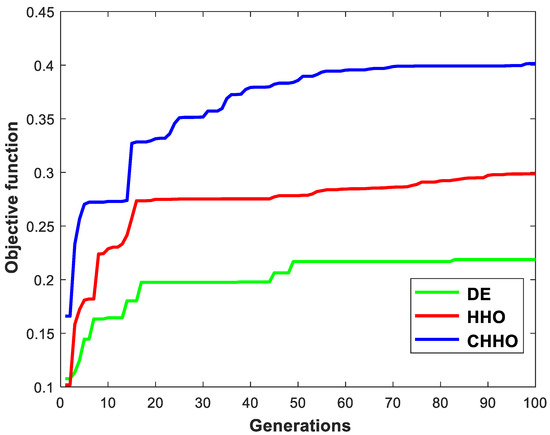 The evolution of the objective function depending on the number of generations is given in Figure 5 using different algorithms. As we shown in this figure, the minimum fitness value is procured using CHHO with the best convergence compared to standard HHO and DE, these results are due to the perfection of the HHO global search by CM, which is worthily accomplished in the optimal solution. Also, CM in HHO presides over the speedy convergence to its global optimality and outfits a switch ploy for the HHO mechanism in the exploration phase that prevents getting stuck in a fake solution. At this juncture, HHO falls in the partial solution region, which emphasizes the importance of CM in handling the HHO deficiency. The optimal parameters discovered by the proposed algorithms are shown in Table 5.