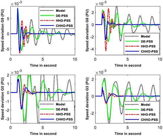 Figure 7 illustrates the system response of speed deviation with different algorithms under the disturbance of operating condition 2. The simulation results obtained clearly indicate that the system response is greatly improved with the proposed CHHO-PSS in terms of settling time and overshoots, and it speedily reached the steady state in comparison with another algorithm. Hence, we can partially accept that the system equipped with CHHO-PSS supplies superior damping characteristics of electromechanical modes and it attains transient stability rapidly compared to HHO-PSS and DE-PSS, which proves that the iterative map gives a suitable improvement. The appreciation assortment of PSS parameters leads to satisfactory robustness. With regards again to these figures, it can also be noticed that the test system without any stabilizer is unstable and the generator has lost its synchronism.