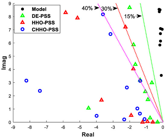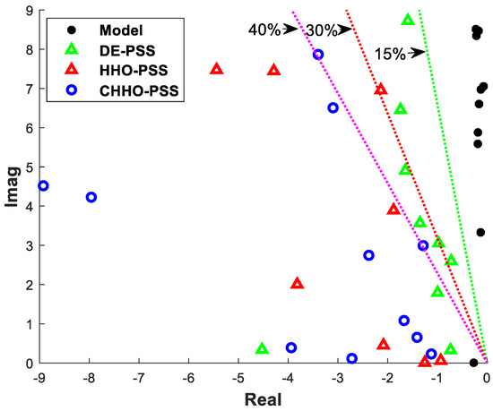 The model eigenvalues with the suggested PSS tuning for mentioned systems are revealed in Figure 8 and Figure 9 showing the eigenvalues of the electromechanical mode through damping ratios axes for the two studied conditions, respectively. From a general point of view, the results above indicate that the power system without PSS is installed. It can be seen that the modes are badly damped for two operating conditions with the intention that the power system is clearly unstable. On the other hand, it can be understood that all electromechanical modes with mentioned CHHO-PSS including local and interregional modes are appreciably moved to the left side in the s-plane by enhancing concurrently both damping ratio and the eigenvalues real-part in which the least damping ratio is skipped up 40 % for two operating conditions. The perfection resulting from the linear model is in superior approval compared with that obtained by the nonlinear model. The full view of the results demonstrates the inherent strengths of the suggested chaotic map to obtain the best power system stability and refine the HHO drawback.