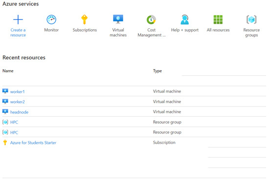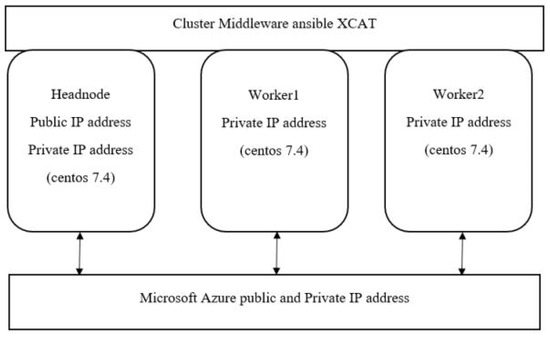 When a computer cluster is deployed in a cloud, s shown in Figure 3, the students must create at least three instances of Virtual Machines (VMs), for a headnode and two workers/compute nodes. The VMs are pre-configured with all the required basic hardware infrastructure (CPUs, memory and storage, and operating system software such as Linux CentOS. To define network connectivity for the virtual machines, a network interface is configured by specifying virtual network, subnet with a range of private IP addresses to be used for the interconnect within the local cluster network, and a public IP address for the headnode. Once the VMs are running, the VCC and cluster middleware can be deployed on the headnode and the worker nodes VMs. Even though the students are interacting with instances of virtual machines on the cloud, the procedure of the software environments configuration is no different to the procedure carried out using physical machines.