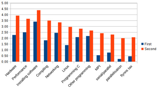 In Figure 4, the skills audit results for the cohort using the OSCAR middleware is shown. It can be seen that the HPC specific skills in the right have a low score at the start of the module, as expected. At the end of the module (the second survey), the students’ scored their own understanding of these topics.