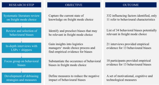 These research questions are answered by considering different aspects of decision making. The remainder of this paper is divided into five sections. Section 2 presents the methodology used to collect data. A systematic literature review and a qualitative approach were chosen as the methodological approach. Interviews and focus groups were conducted in order to collect empirical data. Section 3 outlines the results of a literature review on freight mode choice and therefore provides a theoretical background. Section 4 focuses on behavioural biases in freight mode choice, literature as well as empirical results are presented. Section 5 displays measures to eliminate behavioural biases. Section 6 concludes the paper with insights, implications and further research.