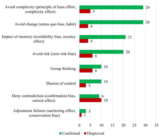 The detailed set of influencing factors, which resulted from the literature review (Table 2), suggests that mode choice is a process based on well-defined rational and objective decision criteria. However, many studies show that behavioural patterns and personal characteristics of the decision maker, such as gender, age, environmental awareness, perception of certain transport modes and experience, have a fundamental impact on that person’s decision making (e.g., [,]). Moreover, in the context of logistics, it has already been shown that freight mode choice is subject to cognitive and behavioural patterns which distort rational decision making [,,]. These patterns are often referred to as behavioural biases. Mattauch et al. [] define biases as systematically incorrect beliefs. A similar definition is given by Gibbons et al. []; they define biases as large, systematic errors in decision making caused by the use of heuristics to simplify mental processing. The main purpose of biases is saving time and energy for the human mind. The existence and usefulness, but also the trade-offs and mental errors caused by behavioural biases, are easier to grasp by keeping in mind the underlying problem that they should solve, e.g., complexity or incomplete information [].
