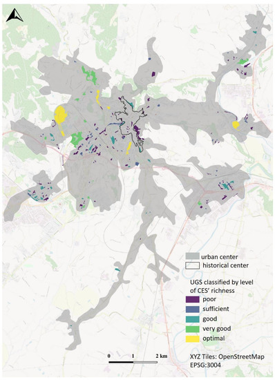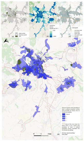 Next, we collected the citizens’ requests for CES. For every requested cultural service (dc), we defined a subset of UGS1, UGS2, containing all the accessible green areas providing an attractive dc (Equation (2)):