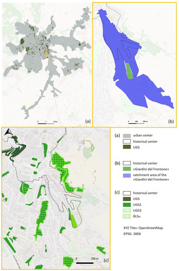 In this paper, we studied Perugia: a medium-sized city in central Italy. According to the National Statistical Institute [43], the Municipality of Perugia had a population of 165,956 inhabitants as of 1 December 2020. A total of 67% of them lived in the urban center, which is about 42 km2. As is the case in other historic cities [44], the UGS strategy faces challenges in Perugia owing to its extremely high-density living and the high value of land. This urban fabric requires particular policies that address the limited number of existing greenspaces, a reduced availability of open spaces to be utilized as new green spaces, and the pressures of the real estate market calling for new land to develop.