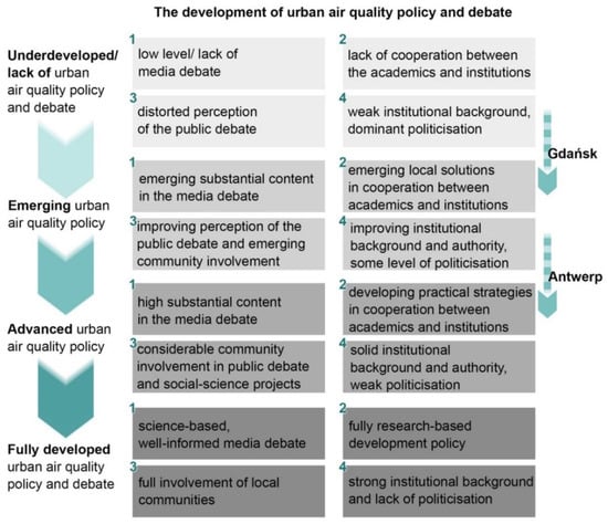 The public debate and policy development on the topic of air quality was discussed from the point of view of the local institutional and bottom-up approaches and on the local experts’ thoughts on the experiencing and managing of air quality. This allowed for modelling the dimensions of the debate and policy development and identifying its key characteristics. The features include: (1) the level of the media debate, (2) the level of cooperation between the academics and institutions in developing research-based policy, (3) the perception of the public debate, also connected with the involvement of local communities, and, finally, (4) the institutional background and the level of politicisation of air quality management. Four levels of the development of urban air quality policy and debate were identified and the cities of Antwerp and Gdańsk were placed on that scale based on the analysed statements of the local experts and the available secondary materials.