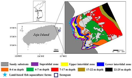 Coastal areas are among the most valuable ecosystems in the world due to their high biodiversity and productivity [1]. However, coastal areas have been severely affected by natural and anthropogenic events such as climate change, coastal development, and excessive nutrient release from various human-related activities [2,3,4]. In particular, effluents from aquaculture and sewage treatments cause coastal eutrophication, which results in algal blooms, hypoxia, and changes in the macroalgal community [5,6,7]. Green macroalgal blooms in the Gulf of California are caused by fertilizer runoff through channels and streams [8]. Since 1986, the number of land-based fish farms on Jeju Island, Korea, has increased rapidly, with more than 350 land-based fish farms along the coast of Jeju Island as of 2020 [9]. As a result of this increase, a large amount of fish farm effluent with high nutrient concentrations is discharged off the coast of the island [10,11]. Therefore, macroalgal dynamics in terms of changes in community structure and nutrient incorporation by macroalgae have received considerable attention in an attempt to understand the nutrient budgets and current status of the coastal ecosystems off Jeju Island.