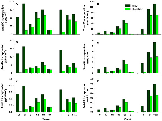 Areal and total estimates of carbon (A,D), nitrogen (B,E), and phosphorus (C,F) incorporation by the macroalgal community off Handong, Jeju Island, Korea, in May and October. UI, upper intertidal zone; LI, lower intertidal zone; S1, 0–4 m below the mean sea level; S2, 4–7 m zone; S3, 7–17 m zone; S4, 17–22 m zone; I, intertidal zone; S, subtidal zone.