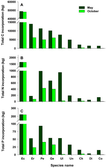 Total estimates of carbon (A), nitrogen (B), and phosphorus (C) incorporated by the main macroalgae off Handong, Jeju Island, Korea in May and October; Ec, Ecklonia cava; Er, erect coralline algae; Pe, Peyssonnelia caulifera; Ge, Gelidium amansii; Ul, Ulva spp.; Un, Undaria pinnatifida; Ch, Chondracanthus tenellus; Di, Dictyota coriacea; Co, Corallina pilulifera.