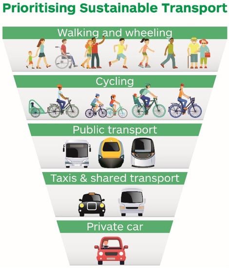 Sustainable development is perhaps the essential idea of our present time [60]. Responding to the challenges of climate change and energy security, people, institutions, and governments at all levels are seeking ways to transition towards more sustainable energy systems using new energy sources and technologies [61]. Reducing car use, traffic congestion, CO2 emissions, and transport-induced stresses on the environment and public health is critical in transitioning toward sustainable urban futures [62]. Transport is responsible for almost 25% of global energy-related greenhouse gas emissions, a share that has been shown to be increasing [29]. Sustainable urban transport is one of the essential elements of sustainable development, as transport-based carbon emissions constitute a significant cause of air quality problems [63]. Several modern cities around the globe are suffering increasing operational complexities as their populations grow and new transport systems are considered, from bicycles to underground systems and car-sharing services [64]. The National Transport Strategy of Scotland proposed the following pyramid for prioritizing sustainable transport (see Figure 1).