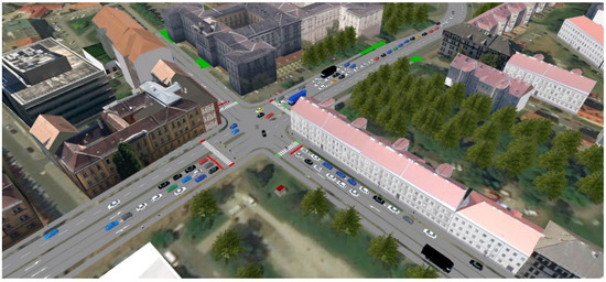 A microscopic simulation was created using PTV Vissim software. The simulation represents the current state of operation and also shows the location of the measuring station (see Figure 2).