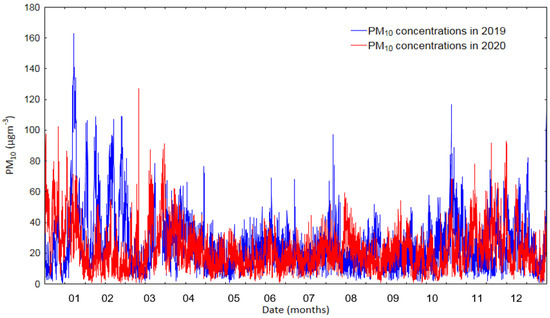 Graphical visualization of PM10 concentration levels in 2019 (blue) and 2020 (red).