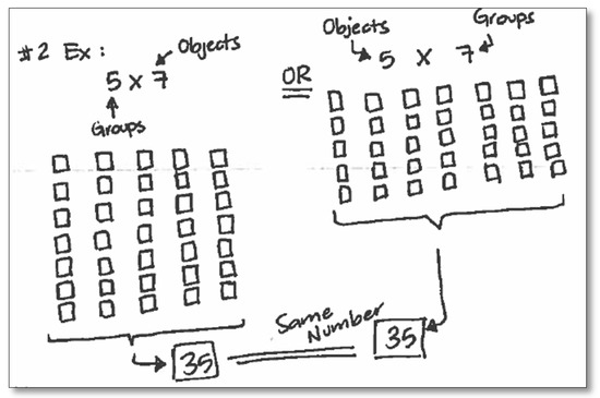 The multiplication symbol × is the result of modeling a computational situation. Until the early 20th century, multiplicative concepts were commonly considered repeated addition. Since the 1960s, the structure of multiplication has highlighted laws of arithmetic such as commutative, associative, and distributive laws so that the Cartesian product has been emphasized as a meaning and structure of multiplication [50]. Research on multiplication has classified situations that can be modeled by multiplication. Greer [56] classified four situations that can be modeled by multiplication, which include (1) equal groups—a number of groups of objects having the same number in each group, (2) multiplicative comparison—verbally expressed by “n times as many as” so that an amount of objects expands as the number of sets, (3) rectangular area and rectangular array—considers an area of an m × n rectangle and an arrangement of mn objects in a rectangular array with m rows and n columns, and (4) the Cartesian product—the formal definition of m × n, where the first component, a set with m elements, and the second component, a set with n elements, are used to produce a set with mn elements [56,57,58]. However, such a variety of multiplicative situations often causes difficulties for children learning multiplication. For example, students easily connect multiplication to the equal group situation by repeated addition, but have difficulties in connecting multiplication to the area of rectangles by the length times width formula [59].
