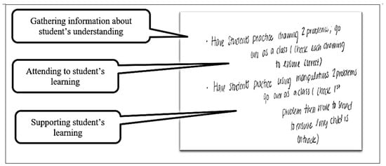 Regarding assessment, we investigated how PTs approached students’ mathematical thinking and responded to individual students based on their mathematical thinking through formative assessment. Effective use of formative assessment would address students’ needs and be truly responsive. PTs used formative assessment for gathering and sharing, attending with interpretation, or supporting with feedback. Approximately half of the PTs used formative assessment geared toward gathering and sharing. For example, a PT #2 asked students to solve problems on the board and explain their thinking (gathering information about students’ understanding and ability to solve the problem) but did not advance her plan for using students’ mathematical thinking (attending to gathered information). Thirty-five percent of PTs gathered information on students’ mathematical thinking and used the information to attend to their learning. Approximately, 15% of PTs gathered information, attended to the information, and supported and provided feedback. An example of the last case can be found in PT #6 (Figure 3).