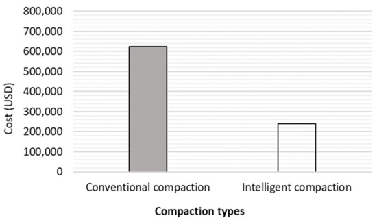 - The initial construction cost of conventional compaction is higher compared to intelligent compaction. Based on the results of the cost input, conventional compaction is approximately 4.1% higher than the intelligent compaction.