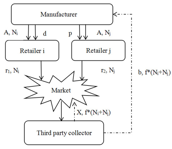 A retailer’s demand depends on the competitor’s retail price and its own retail price. As suggested by Tsao et al. [57] and Kumar Jena et al. [41], the demand function can be thought of as the accompanying structure, i.e., Ni = α1 − β1·r1 + γ1·r2 for the retailer i and Nj = α2 − β2·r2 + γ2·r1 for the retailer j. Moreover, demand is considered deterministic and non-stochastic. α1 > 0 and α2 > 0 represent the market size of retailer i’s and retailer j’s products, respectively. The parameters β1, β2, γ1, and γ2 are positive numbers and assumed to be independent in nature.