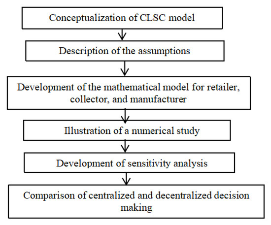 The market activities and the CE are critical aspects to enhancing the market share in the present complex value chain. Shevchenko et al. [66] emphasized the need for incentives to promote and boost the implementation of the CE concept. Incentives help in combating market failures that forestall or defer the change towards circular items, administrations, and arrangements. Therefore, this study develops mathematical models to analyze the impact of a manufacturer’s incentives on the decisions of channel partners under the retail competition in the CLSC. Figure 2 shows the framework developed by the authors to analyze the proposed model.