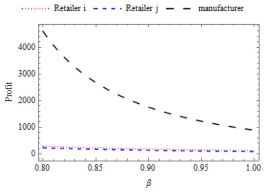 Here, the authors investigate the influence of β on the profit of three players of CLSC that is retailer i, retailer j, and manufacturer. Figure 4 shows that the profit of the manufacturer decreases significantly with the enhancement in β, whereas the profit of both the retailer decreases marginally with the rise in the value of β. However, at a particular value of β, the profit of the manufacturer is highest, and the profit of retailer i is marginally higher than the profit of retailer j. Moreover, Table 3 also indicates that the profit of each member decreases with the rise in the price elasticity. However, credit period p and cash discount d increase with the increase in the price elasticity. This signifies that the manufacturer must grant a prolonged credit period and a substantial cash discount when the demand possesses more sensitivity towards the retail price.