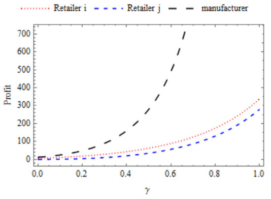 The effect of cross-price elasticity γ on the profit of retailer i, j, and manufacturer is depicted in Figure 5. It is observed that the profit of all the three members of CLSC increases with the increase in γ. However, the rise in the profit of the manufacturer is significantly more than the profit of both retailers. At a particular value of γ, the profit of the manufacturer is highest followed by retailer i and retailer j. Moreover, Table 4 also signifies that the profit of each member increases with the rise in the cross-price elasticity γ. However, cash discount d and credit period p decrease with the rise in the γ. This implies that the manufacturer can give less cash discount and a shorter period for a credit to the retailers in the case of the higher sensitivity of the demand towards the competition between the retailers.