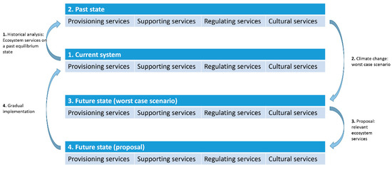 - Combine: An analysis of the relevant ecosystem services enables one to systematically reveal and highlight the local qualities. The combination of ecosystem services identification with the previous steps creates the criteria for a generic framework of alternative future conditions, based on which various alternative scenarios are formulated. Specifically, the first step of the proposed strategy results in a number of qualities, values, and concepts that were used to characterize the study area in previous states when the system was more in balance. These are supposed to serve as a starting point for the new desired (more climate adaptive) situation. Additionally, the outcome of the second step of the proposed strategy is a visualization of the worst-case scenario in terms of climate change for the study area, aiming at revealing possible untapped potential;