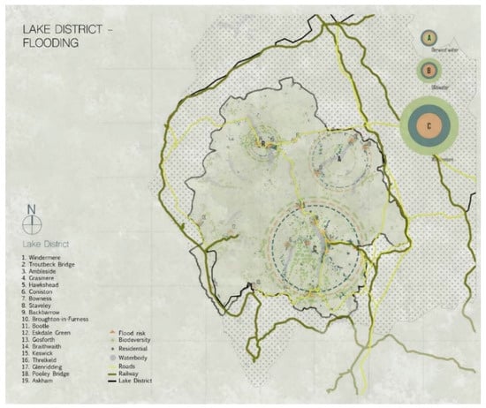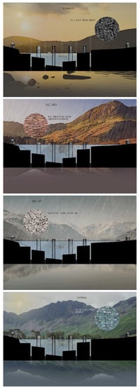 The research and design studios focused on the low-density, high flood risk region of the Lake District, UK. The main approach of the studios was based on ways to cope with the direct and indirect impacts of climate change in the Lake District (i.e., extreme weather phenomena, flooding). The students paid special attention to the impact of climate change on food, energy, and water. Mapping and explorative spatial design aimed at an analysis of the regional complexity. The studios were evidence-based and supported by a situated learning environment []. The regional scale was the point of departure; however, the scale of the student projects varied based on the student preferences and positioning.