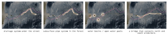 After collecting information and combining different types of water management in the town of Windermere, the student identified two types of water management systems well-suited for this specific location (Figure 7). Firstly, a drainage system is applied under the street, parallel to the river, leading the excess water to the forest. The water is allocated to several water basins via a subsurface pipe system, where the water can be stored during heavy rainfall. Some of these water basins are also used as open pools. Secondly, if the drainage system becomes insufficient for flood prevention, a bridge, connecting the north and south Windermere, will operate (Figure 8). At the top of the columns of the bridge wind turbines are designed to provide power for heating the pools. The excess power will be used by the inhabitants of the village.