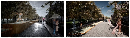 4.2.1. Design Research Project 1—Don’t Fight the Water, Embrace it! The Dancing Streets Concept