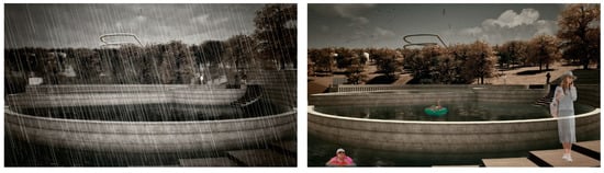 Cultural Services: outdoor spas/ water basins in the forest, which are supposed to enhance social interaction (Figure 11). The pools are supplied with water through the subsurface pipe system. Each pool has its own supply and discharge of water. The inlets and outlets are opened or closed automatically in case of heavy rainfall.