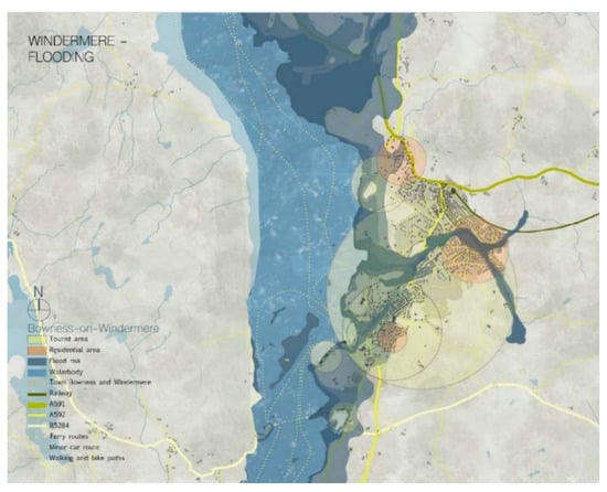 The worst-case flooding scenario was developed by analyzing the current flood risk areas via altitude maps that demonstrated an extreme increase in floods and rainfall in Windermere. As depicted in Figure 6, during heavy rainfall, the narrowing of the Mill Beck River causes flooding in Windermere. According to the worst-case scenario, the illustration of which has been based on maps of previous flooding of the area [] in combination with the topography of the place, the river may split the town into two disconnected parts.
