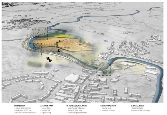 The identification of the relevant ecosystem services leads to more comprehensive proposals that take the physical and the mental sphere into account. All three projects explored, by implementing research by design, how spatial interventions can create a positive impact on the area. For instance, in the first case, the dancing street concept is mostly related to regulating ecosystem services (street design); however, the transformation of the street elements into an interactive spatial game in case of heavy rainfall relates to cultural services as well, affecting the social/cultural/identity-related sphere. In the second project, cultural services are prioritized. However, the regulation of services is also taken into account by allowing the towers to flood and thus making them more resilient. Finally, in the third case, provisioning and supporting services play a key role (with the proposed system of terrace cultivation and by deliberately giving space to excessive water, in case of flooding). However, the route connecting the two towns is also directly related to cultural services.