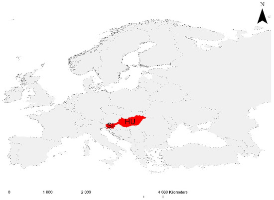 Geolocation of Hungary (HU) and Slovenia (SI) within Europe. Source: authors’ construction, shape downloaded from [17].