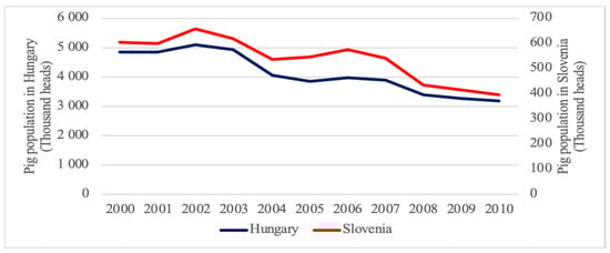 Decrease in Hungarian and Slovenian pig population to the same extent, 2000–2010. Source: authors’ construction, based on data from [20,21,22].