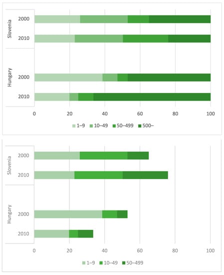 Distribution of pig population by farm size in Hungary and Slovenia (in percentage). Source: authors’ construction, based on data from [18,19,21,22].