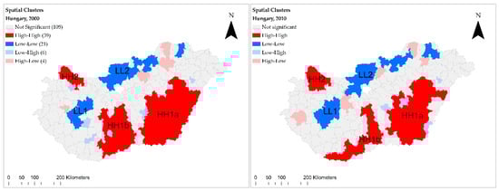 Two low–low spatial clusters (marked in blue) are identified in two mountainous or hilly regions, which are naturally less favored areas for pig farming. LL1 is located near Lake Balaton, where agricultural activity is limited and strongly controlled by environmental restrictions.