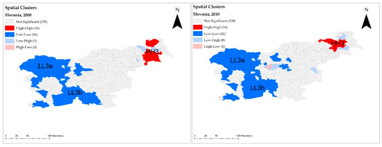 LISA * cluster maps of the Slovenian pig population, 2000 and 2010. * Local indicator of spatial autocorrelation (local Moran’s I has been used as indicator). HH: high–high cluster, and LL: low–low cluster. Source: authors’ estimation.