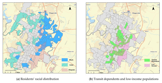 To identify socially disadvantaged groups across the city, census-tract-level datasets from the US Census Bureau were used (Figure 1). The percentage of the total population of socially disadvantaged groups living in each census tract was calculated and presented as a social equity indicator. The calculated percentages were grouped by quartiles. Tracts with the highest concentration of each social characteristic are shown in Figure 1 (Black, Asian, and Hispanic in Figure 1a, and transit dependents and low-income population in Figure 1b). As can be seen, Black individuals mostly reside in the eastern part of the city. Asians live mostly in the west. Transit-dependent residents are mostly located in the central part of the city. Low-income individuals are slightly more dispersed and are located in the east and the city center.
