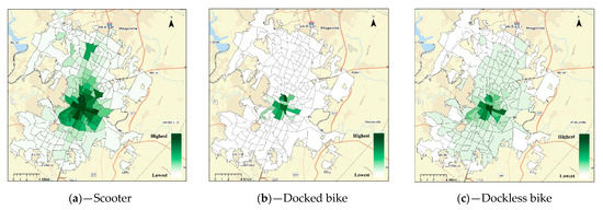 As mentioned earlier, building on both the capability approach and Marten’s framework, shared vehicles can only be called accessible if individuals are both physically close to the vehicle and able to use it to satisfy their travel needs [5]. In other words, it would be misleading to only consider the geographical proximity of micromobility vehicles as an accessibility indicator. In this study, analysis of accessibility for shared micromobility services is focused on two measures—physical closeness and ability to use. To capture these two measures, the average number of scooter and bike trips in each census tract during the time that micromobility vehicles were available and utilized in the area were used as a proxy for accessibility. Trip history not only showed that scooters were physically available for riders, but also that riders were able to overcome the barriers of renting micromobility vehicles. In other words, when a trip was made, it showed that vehicles were available, that the individual could afford to pay the fees by providing a credit or debit card for collateral, was physically and mentally able to ride, and had sufficient knowledge, skill, and ability to rent the vehicle using the mobile app technology.