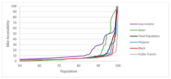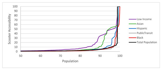 Moderate evidence of differences in access to bikes and scooters by race at the census tract level was detected across the City of Austin. The regression models revealed that census tracts with a higher proportion of Black residents were less likely to have access to both bikes and scooters. As the literature has shown that the perceived value of micromobility vehicles can vary with socio-cultural aspects and community characteristics [67], differences in findings by race are not unexpected. Furthermore, bikes are frequently considered a potential mode of transportation for either very low-income or very high-income families [68]. The regression results support this, as positive associations for both bike and scooter accessibility amongst low-income populations were observed. Supporting these regression findings are Lorenz curve findings showing that Asians had a slightly higher level of accessibility to bikes and scooters than those of other social equity categories. It should be noted that the sociodemographic analysis also showed that Asians also resided in more affluent areas of the city. The correlation analysis also showed negative associations between the Asian population and the Hispanic and Black populations. Moreover, the Hispanic and Black populations often resided in less affluent areas.
