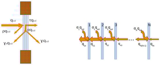 The principles of deriving the total solar energy transmittance g are explained in [22]. Incident solar radiation falling on a glazing is partially reflected, partially transmitted, and partially absorbed by the glazing (Figure 1 (left)). The absorbed solar radiation is re-radiated, partly to the inside of the building and partly to the outside. The solar gain represents the part of the heat flux density of the incident solar radiation that penetrates the building and is composed of the transmitted solar radiation () and part of the absorbed solar radiation emitted to interior ():