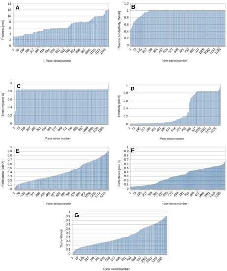 Distribution of optical properties of glass panes available on European market: (A) thickness, (B) conductivity, (C) emissivity (side A), (D) emissivity (side B), (E) reflectance (side A), (F) reflectance (side B), (G) transmittance. The panes are sorted by studied parameter and than presented in a graph. Each vertical line presents one pane.