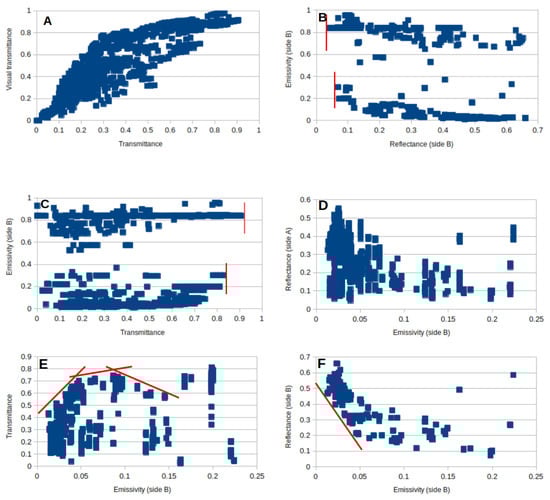 Correlation between optical properties of glass panes availabe on European market: (A) transmittance for solar spectrum (horizontal axis) vs visual transmittance (vertical axis), (B) reflectance on a side with low-emissivity coating (horizontal axis) vs emissivity on a side with low-emissivity coating (vertical axis), (C) transmittance (horizontal axis) vs emissivity on a side with low-emissivity coating (vertical axis), (D) emissivity on a side with low-emissivity coating (horizontal axis) vs reflectance on a side without low-emissivity coating (vertical axis), (E) emissivity on a side with low-emissivity coating (horizontal axis) vs transmittance (vertical axis), (F) emissivity on a side with low-emissivity coating (horizontal axis) vs reflectance on a side with low-emissivity coating (vertical axis).