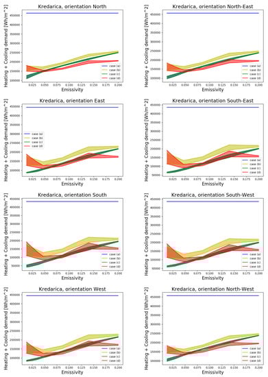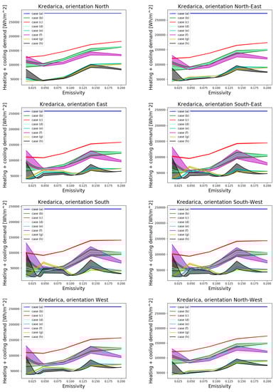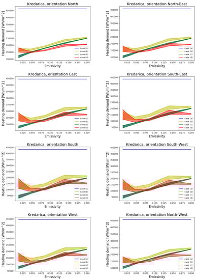 In Figure 5, the heating demand for double glazing on a building with low solar gains in Kredarica is presented for different orientations. Since the average daily temperatures and the highest average daily temperatures do not exceed 20°, there is no cooling demand and the results can be applied to both low and high impedance buildings. As it can be seen from Figure 5, the use of at least one pane with a low-emissivity coating significantly reduces the heat demand. Moreover, the lowest heat demand is obtained with glazing with clear glass for the inner pane and low-emissivity glass for the outer pane with the lowest possible emissivity value. The position of the low-emissivity glass pane (as inner or outer pane) has no influence on the heat transfer coefficient, because the low-emissivity coating is applied only on the side facing the gap. The positioning of the pane also has no effect on the effective transmittance, but it does on the effective reflectance. Since the low-emissivity pane has a slightly higher reflectance on the side with the low-emissivity coating, it reflects more heat when it is facing outward (as an inner pane) than when it is facing inward (as an outer pane). Because of this difference, solar radiation is higher for low-emissivity glazing positioned as an exterior pane. When the emissivity value is higher than 0.05, the heat demand is lower for low emissivity glazing positioned as an interior pane when oriented northeast to northwest, while for other orientations both positions give similar results. When the emissivity is higher than 0.150, a lower heat demand is obtained for the glass with the low-emissivity as the inner pane. Similar results are obtained when the glazing is installed in a building with high solar gains. The only difference is that there is present a small cooling demand for glazing with clear glass for the inner pane and low-emissivity glass for the outer pane with low values of emissivity. The sum of heating and cooling demand for double glazing on a building with high solar gains at Kredarica for different orientations is shown in Figure 6. Similar to a building with low solar gains, glazing with inner clear glass and outer pane with low-emissivity coating gives the lowest value for the sum of heating and cooling demand.