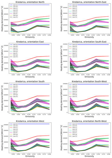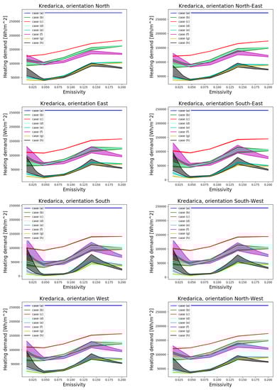 Annual heat loss per square meter of vertically set triple glazing system on object located at Maribor for high impedance building with high solar gains (well insulated or/and windows with large ratio of window area without shading during cooling season): (a) all panes with clear glass without low emissivity coating; (b) inner pane with low emissivity coating, other panes clear glass; (c) external pane with low emissivity coating, other panes clear glass; (d) middle pane with low emissivity coating, other panes clear glass; (e) inner pane clear glass, other panes with low emissivity coating; (f) external pane clear glass, other panes with low emissivity coating; (g) middle pane with clear glass, other panes with low emissivity coating; (h) all panes with low emissivity coating. As in case (a) there is no low-emissivity pane, the glazing has fixed emissivity and therefore the results do not vary with the emissivity. Different cases include low-emissivity glass with different values of reflectance.